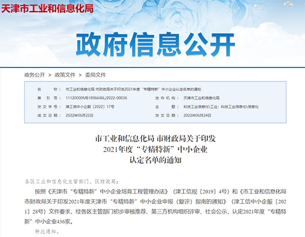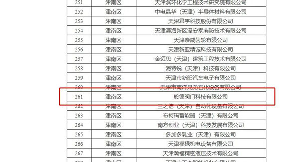近日,天津市工業和信息化局正式發布“2021年度天津市'專精特新'中小企業認定名單通知”,般德閥門成功躋身于名單行列。