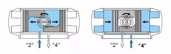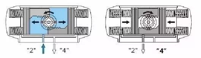 當氣源壓力從氣口(2)進入氣缸兩活塞之間中腔時,使兩活塞分離向氣缸兩端方向移動,迫使兩端的彈簧壓縮,兩端氣腔的空氣通過氣口(4)排出,同時使兩活塞齒條同步帶動輸出軸(齒輪)逆時針方向旋轉。在氣源壓力經過電磁閥換向后,氣缸的兩活塞在彈簧的彈力下向中間方向移動,中間氣腔的空氣從氣口(2)排出,同時使兩活塞齒條同步帶動輸出軸(齒輪)順時針方向旋轉。(如果把活塞相對反方向安裝,彈簧復位時輸出軸即變為反向旋轉)。