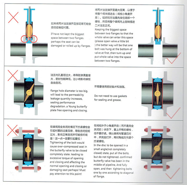 3、在蝶閥完全關閉的情況下擰緊螺栓會引起襯圈的過度壓縮,導致啟閉扭矩過大,影響正常啟閉并可能損壞閥座!