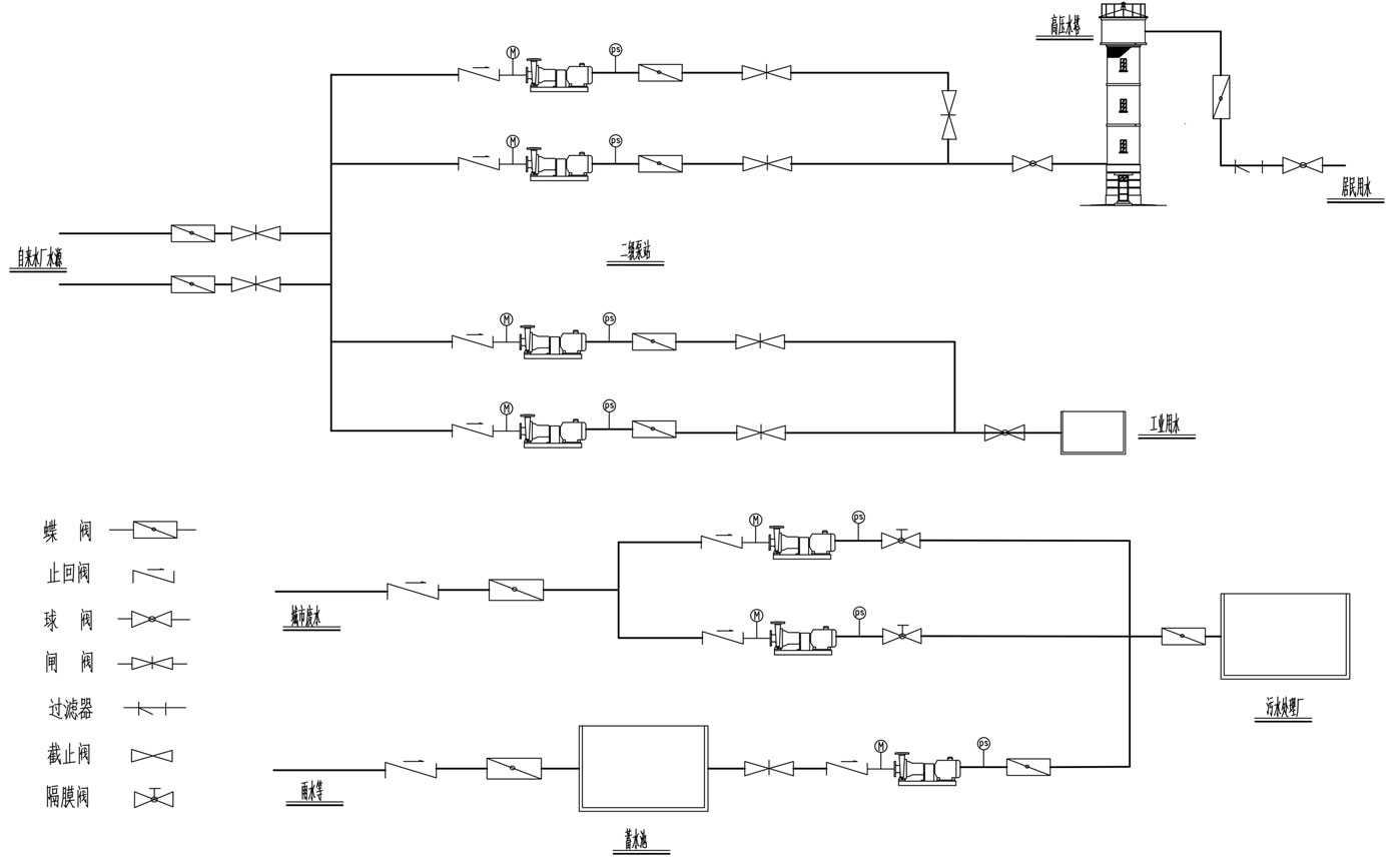 供水系統:保證城市工況企業及居民生活用水輸配,將經過給水處理后的水送到各個給水區域的全部管網,同一泵站內的不同水泵分別供水到水壓要求高的高壓管網和水壓要求低的低壓管網。